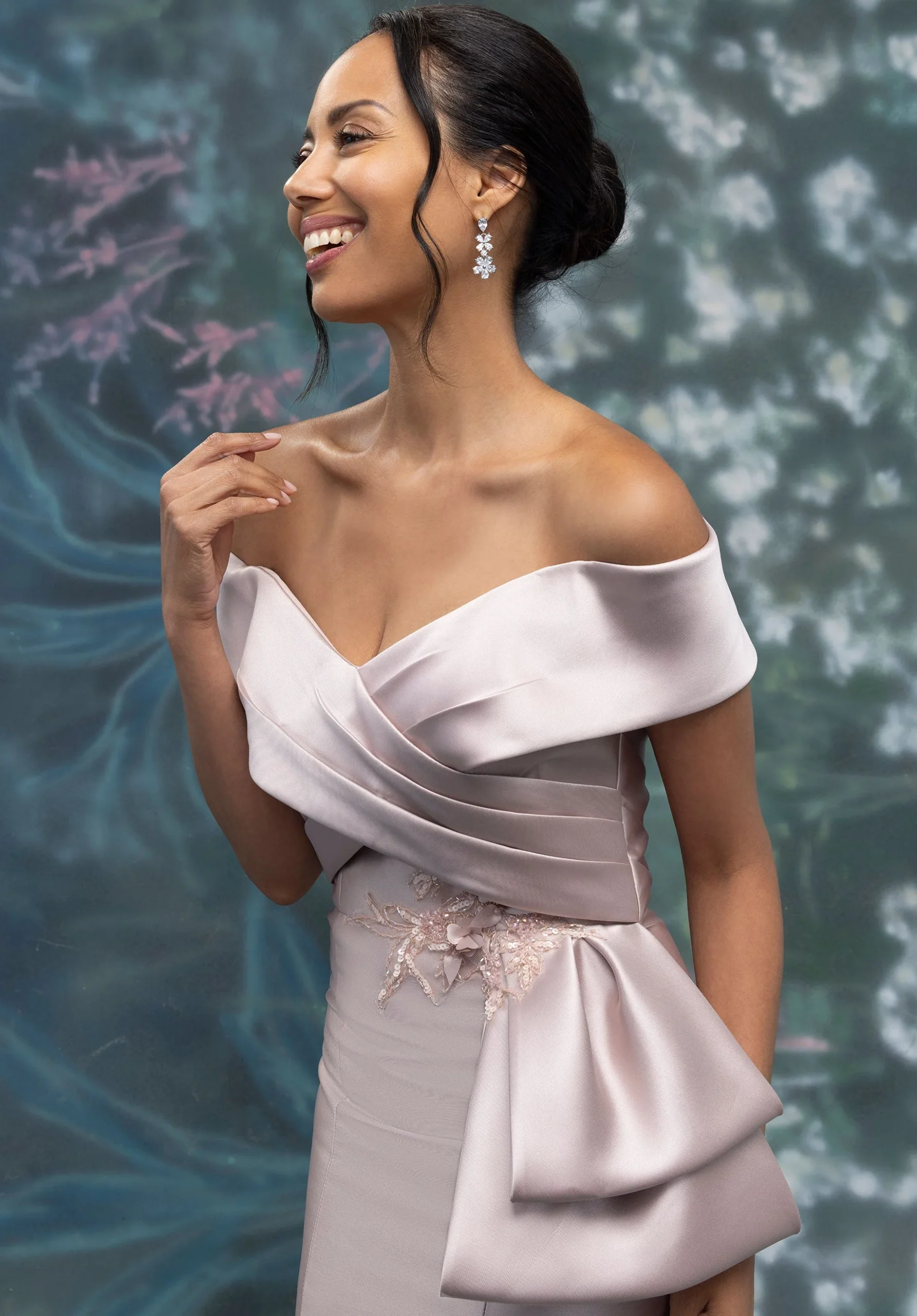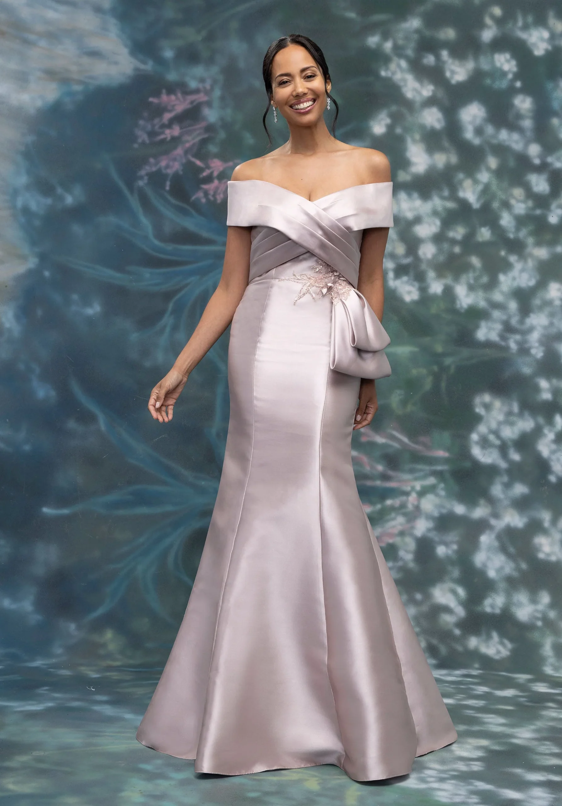 Criss Cross Portrait Neck Mikado Evening Gown with Crystal Appliqués. Mermaid evening gown has a crisscross, pleated portrait neckline on a fitted skirt with princess seams and draped, appliqué waist detail in Mikado.
