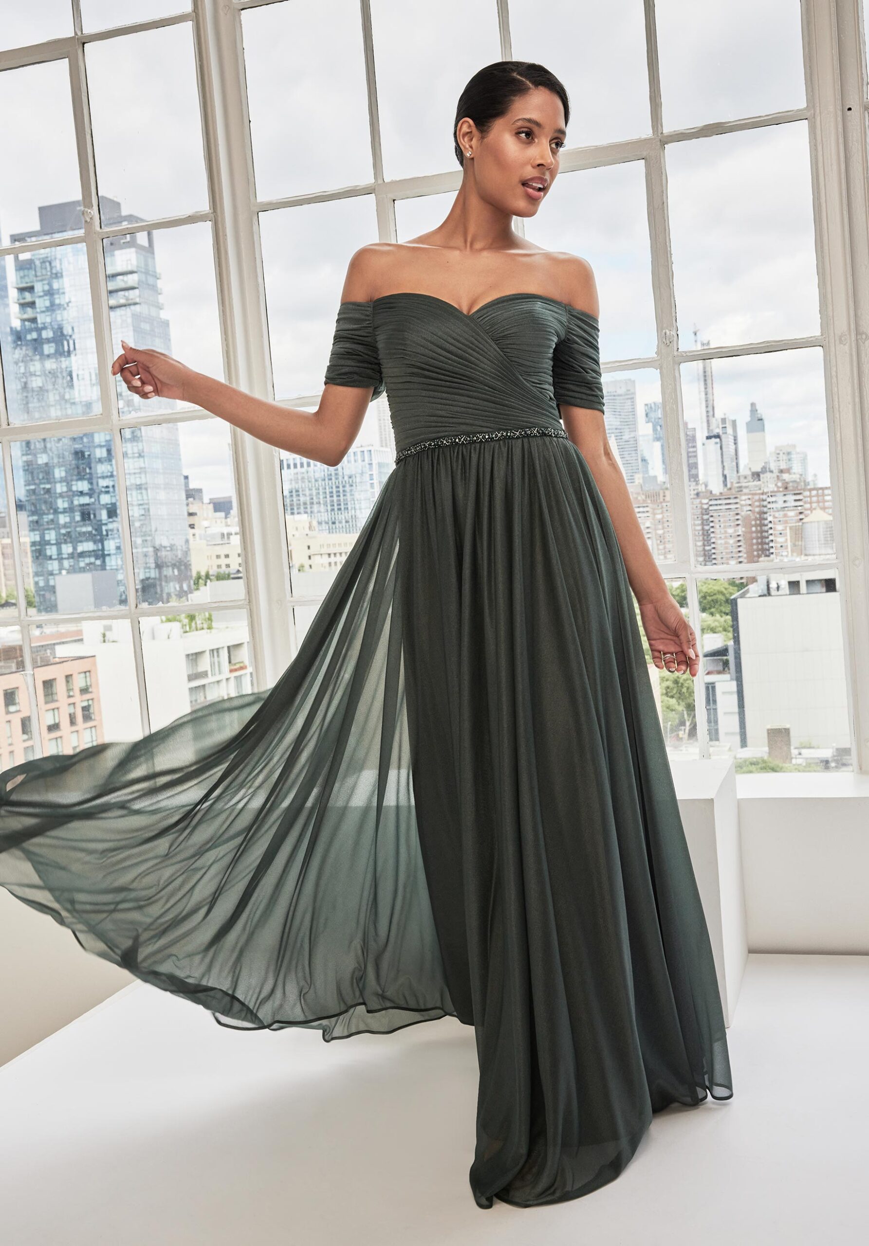 Draped Shimmer Mesh Evening Gown with Crystal Beaded Trim